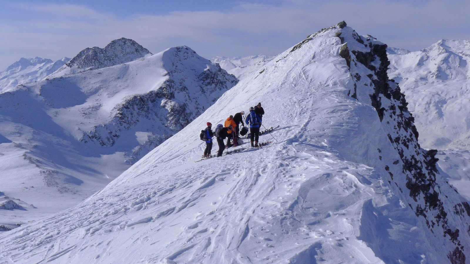 Sieht alpiner aus als es ist: unser Skitourengrüppli auf dem Piz Campagnung (2’820 M.ü.M.) bei eisigen Temperaturen und einem zügigen Nordost.